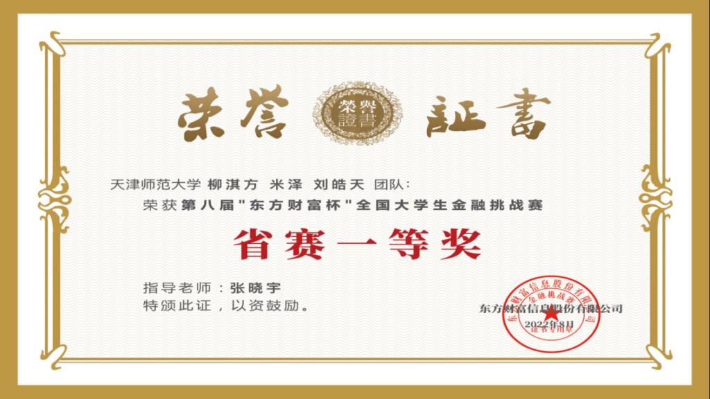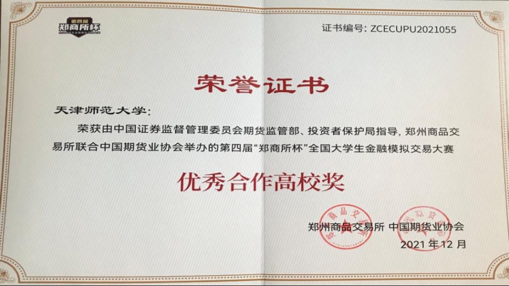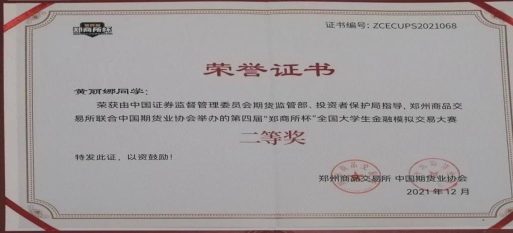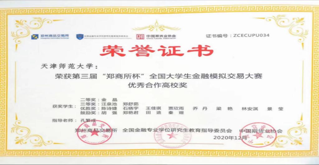 在第三届“郑商所杯”大赛中,投资学系共有15位同学获奖,365best体育亚洲官网获得优秀合作高校奖。在第四届“郑商所杯”大赛中成绩优异,黄丽娜、郭雯旗同学获得二等奖,王佳明、张泽宇同学获得三等奖,冯钰涵、贾智超、史怡君、王靖雯、胡玥同学获得鼓励奖,365best体育亚洲官网再次获得优秀合作高校奖。2022年,在由中国共产主义青年团举办的第八届“东财富杯”全国大学生金融精英挑战赛中,投资学专业学生获得全国二等奖1项,三等奖2项,省赛一等奖3项,省赛二等奖6项,省赛三等奖11项。