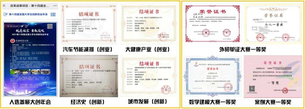 2017年以来,跨专业学生团队的16个项目获得全国大学生创新创业训练计划项目立项,其中,国家级15项、天津市级3项;作为优秀项目入选全国“国创计划”创业实践项目1项。学生大创项目的研究领域涉及大健康、汽车节能、环境保护、文化创意、城市发展、经济史等6个领域。学生团队在全国高校外贸类、营销类等学科竞赛中共获得团体一等奖5项、二等奖5项、三等奖4项;个人一等奖7项、二等奖18项、三等奖8项。