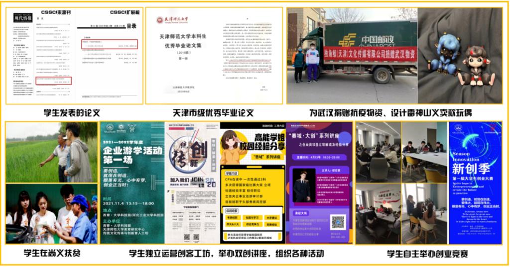 2017年以来,国贸专业学生依托全国大学生创新创业训练计划项目,在专业教师的指导下发表论文23篇。其中,C刊和核心期刊论文各1篇;获评市级优秀本科毕业论文1篇,校级优秀本科毕业论文6篇。学生扶贫创业实践团队深入全国52个深度贫困县之一的河北省尚义县,积极投身服务国家脱贫攻坚战略,通过构建“一产帮你种、二产帮你造、三产帮你销”的精准扶贫新模式,累计帮扶4751户,10179人,户均增收5250元,使尚义县成功脱贫。疫情期间,学生文旅创业实践团队向武汉疫区捐赠抗疫物资3万元;设计雷神山、火神山义卖款所得款项5万元也全部捐赠给武汉疫区。学生活动运营实践团队依托西青大学生产业园连续4年自主运营和主办由天津市高校学生参加的“新创季”大学生创新创业大赛、投资模拟大赛等多项赛事。