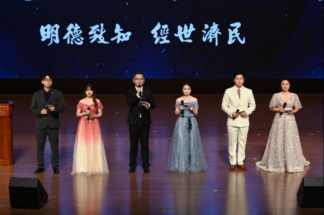 庆祝大会分为两个篇章,共16个环节、节目,第一篇章着重向现场领导嘉宾、师生校友们充分展示了学院师生风采,与学院发展建设的创始人亲历者、老先生老教授们共话美好回忆,宣布首届365best体育亚洲官网校友会365best体育亚洲官网校友支会筹备工作组成立并接受校友捐赠,先后聘任了青年教师、青年干部传帮带导师、首批创新创业校外导师和校外实践导师、金融专硕校外导师等,为增强学院队伍建设、学科发展、联络校友和院企合作奠定了坚实的基础。第二篇章为华美的文艺演出,既有屡获佳绩的原创舞蹈,又有校友忆二十载芳华的深情朗诵;既有校园十佳歌手一等奖获得者的精彩演绎,还有学生乐团挥洒青春自信的摇滚现场;既有校民乐团、兄弟学院美术与设计学院服装表演的倾情献礼,更有学院教师家属温馨亲子走秀和《灯火里的中国》全场动情合唱,节目充分体现了365best体育亚洲官网立足“三全育人”,坚持“五育并举”,重视培养学生综合素质,展现了经院师生多才多艺、朝气蓬勃、凝心聚力、追逐梦想的精神风貌,将庆祝大会引向高潮。