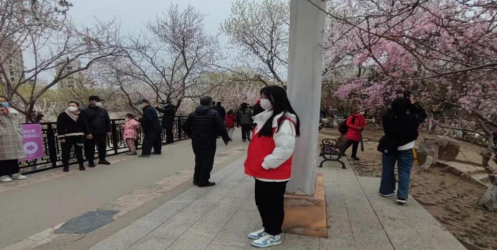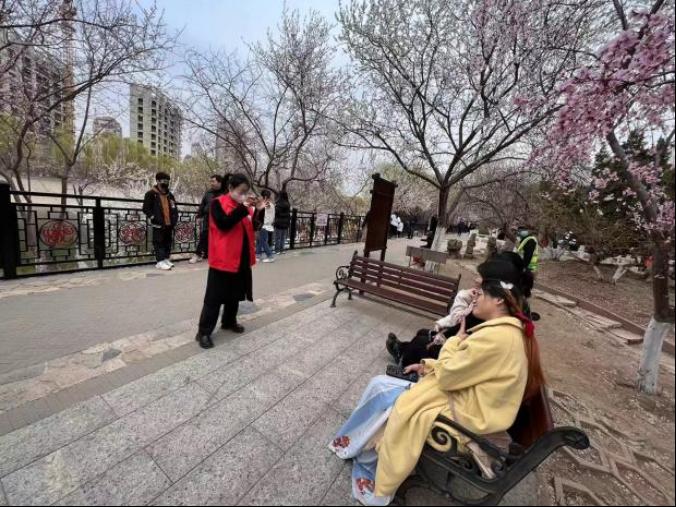 志愿者们来到红桥区桃花园,协助工作人员进行汉服十二花神展非遗展两个点位的准备工作。活动开始后,现场通过天津发布微博、天津发布微信视频号、津云app等平台进行了同步直播。志愿者们也充分发扬主动干精神,积极维护外围秩序,随时观察直播进行情况,引导群众观赏路线,在保障大家人身安全的同时,让市民朋友们都沉浸在诗意灵动的粉红花海的美景中,解锁吃喝玩乐一站式享受。